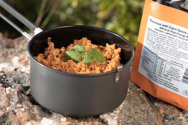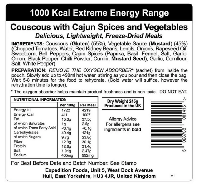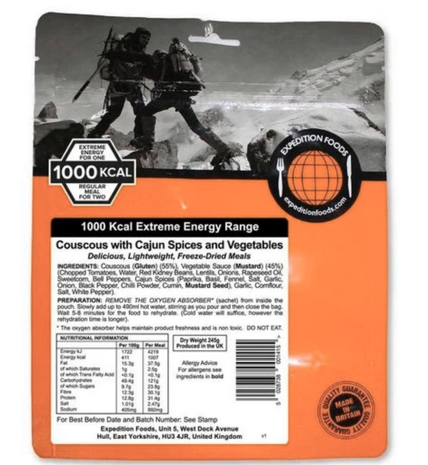 Our Couscous with Cajun Spices and Vegetables is a vegan dream dish -- with couscous made from crushed steamed wheat, this North African dish combines traditional couscous, vegetables consisting of chopped tomatoes, red kidney beans, lentils, onions, sweetcorn and bell peppers with old-fashioned Louisiana cajun spices of paprika, basil, fennel, salt, garlic onion, black pepper and chilli powder. A relatively spicy dish that vegans and non-vegans love, it's best made as the sun sets over the Andean mountain range or on the top of The Quiraing. Add hot water, stir and let sit for five minutes. You'll be back for more.