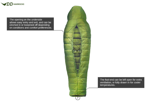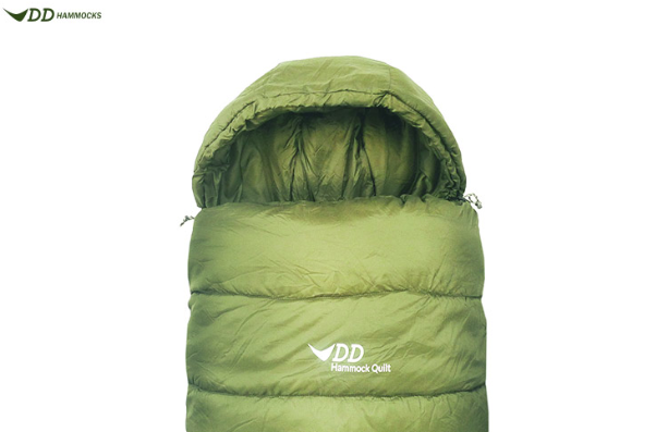 The Hammock Quilt features a three-quarter length opening on the underside, to allow for easy entry and exit when sleeping in a hammock, with an integrated hood and foot covering.