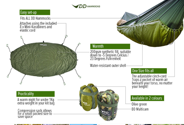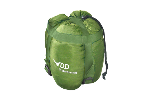 In hammock camping, the majority of heat loss is from below due to your body weight compressing your clothing or the loft in your sleeping bag. The DD Hammock Underblanket combats this by hanging below your hammock so the loft is not compressed, creating a pocket of air warmed by your body heat. It should be hung with a little slack to gently 'hug' the hammock when you're inside, to achieve the warmest insulation.