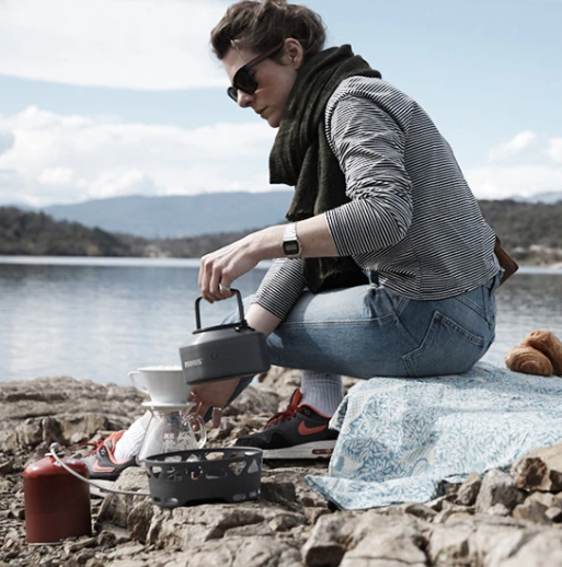 This lightweight coffee/tea kettle made of hard-anodized aluminum is a lovely attribute when camping. Folding handle. Comes in a practical net stuff sack.