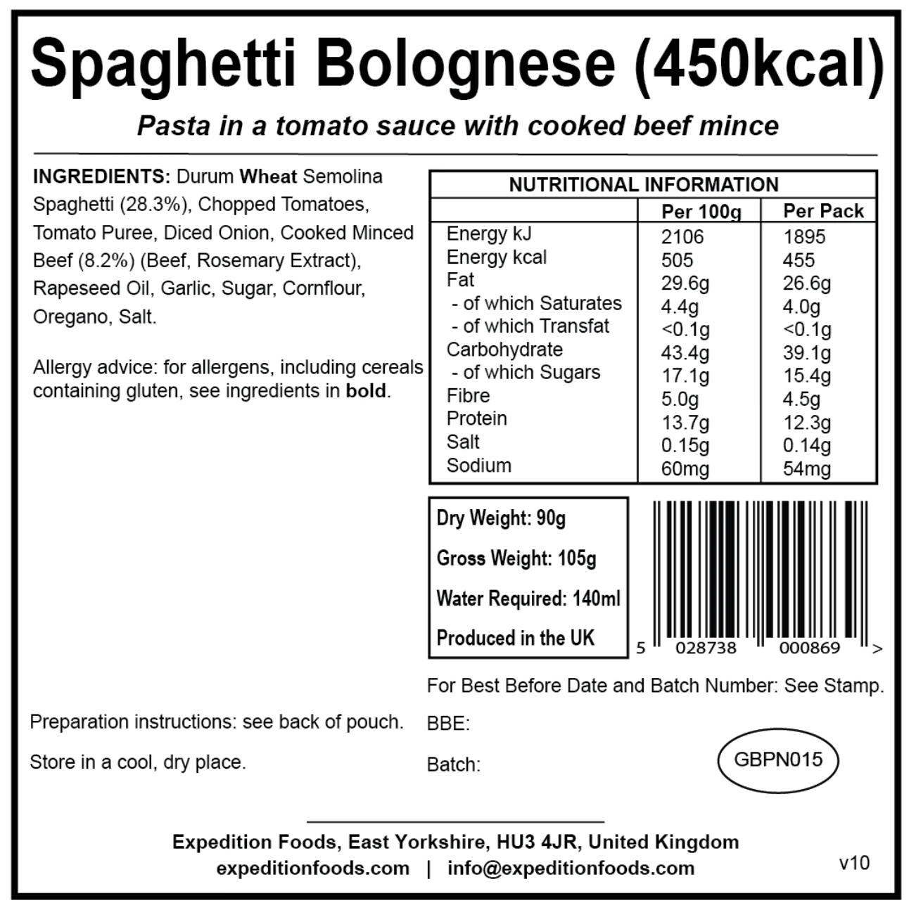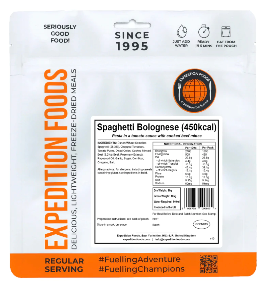 The ultimate comfort food -- Spaghetti Bolognese. Wheat spaghetti topped with a sauce rich in tomatoes, garlic, onions and minced beef infused with an Italian herb mix of oregano, summer savoury, basil, thyme, rosemary and marjoram. This combination produces a delightful hot pasta dish tangled with beautifully rich and smooth bolognese sauce exploding with flavour. Don't leave home without this meal whether you are headed to Wales or the Amazon Jungle, this meal will keep you happy. Just add hot water, stir and wait five minutes.